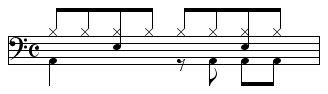バスドラムを1拍目に4分音符、3拍目に8分音符裏、4拍目に8分音符2発で踏む8ビートです。